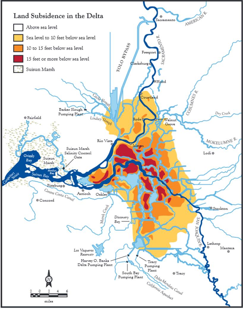 Land subsidence in the Sacramento-San Joaquin Delta. Yellow is 0-10 feet, orange is 10-15 feet, red is more than 15 feet. Image via http://www.ppic.org/content/pubs/report/R_207JLR.pdf